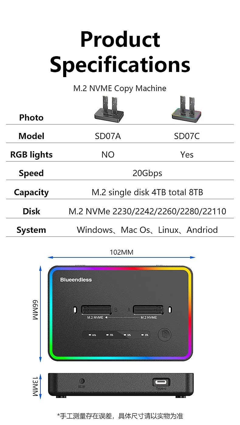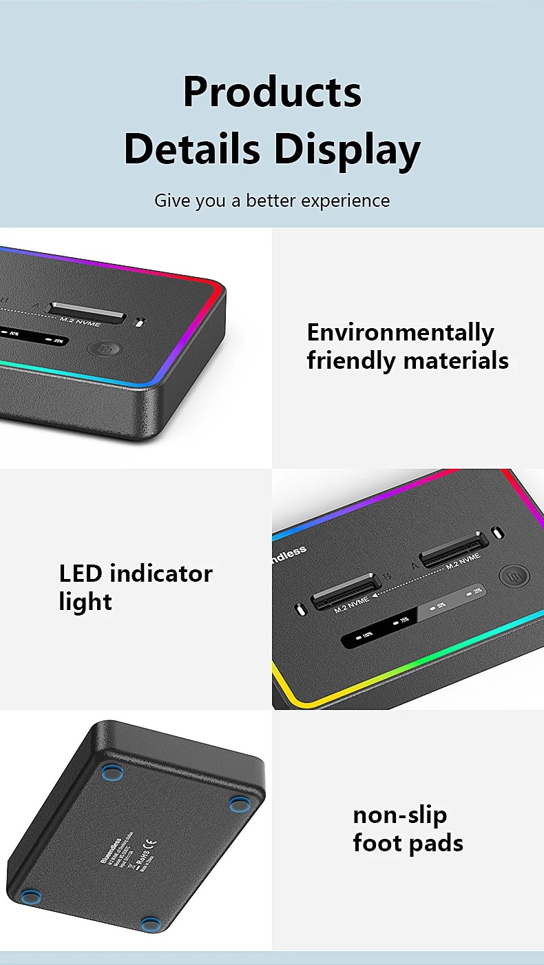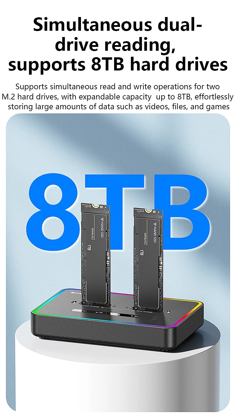פתרון קומפקטי ומהיר לשכפול וגיבוי של שני כונני M.2 NVMe במקביל, עם חיבור מתקדם ומהיר במיוחד USB 3.2 Type-C Gen 2x2 20Gbps.