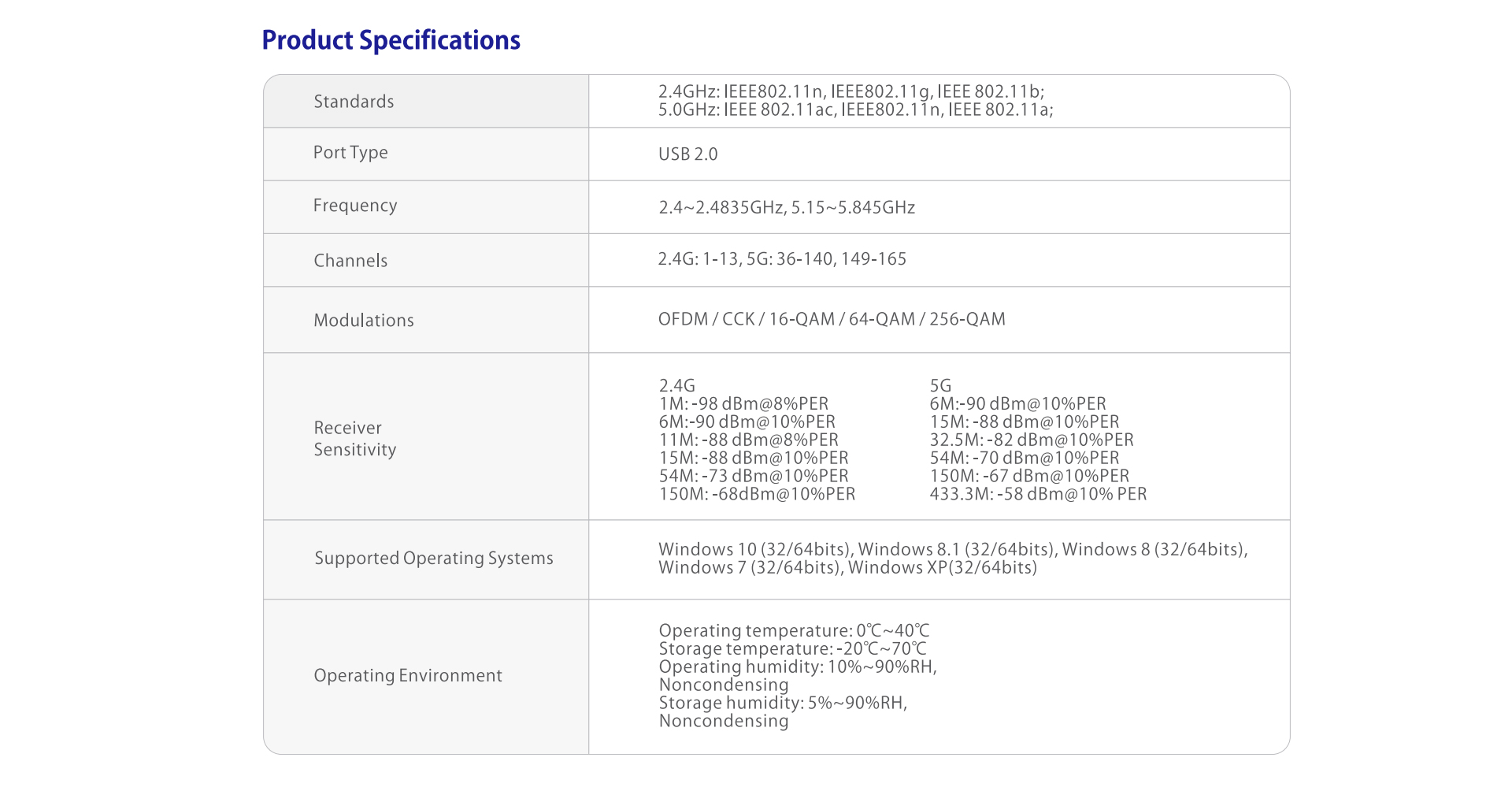 כרטיס רשת USB עוצמתי, הנותן מענה לקליטה טובה של רשת ה- WiFi האלחוטית שבסביבתכם, הן בתדר 5GHz והן בתדר 2.4GHz.