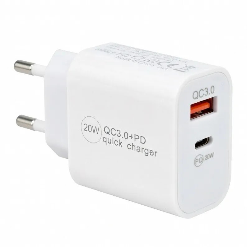 מתאם טעינה קומפקטי בצבע לבן, המאפשר לטעון עד 2 מכשירים בו-זמנית. המתאם כולל יציאת USB-C מהירה ויציאת USB-A עם תמיכה בטעינה מהירה.