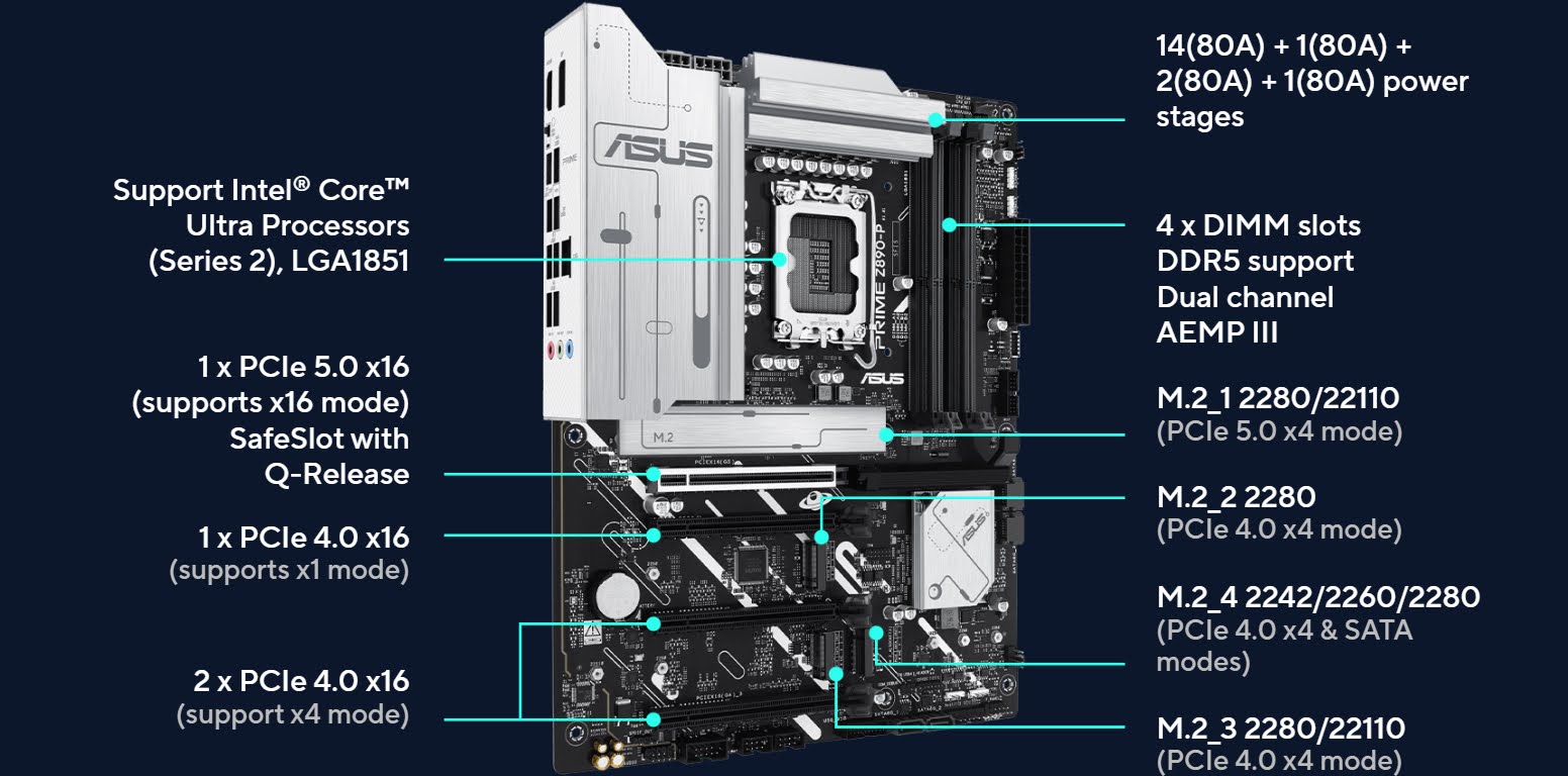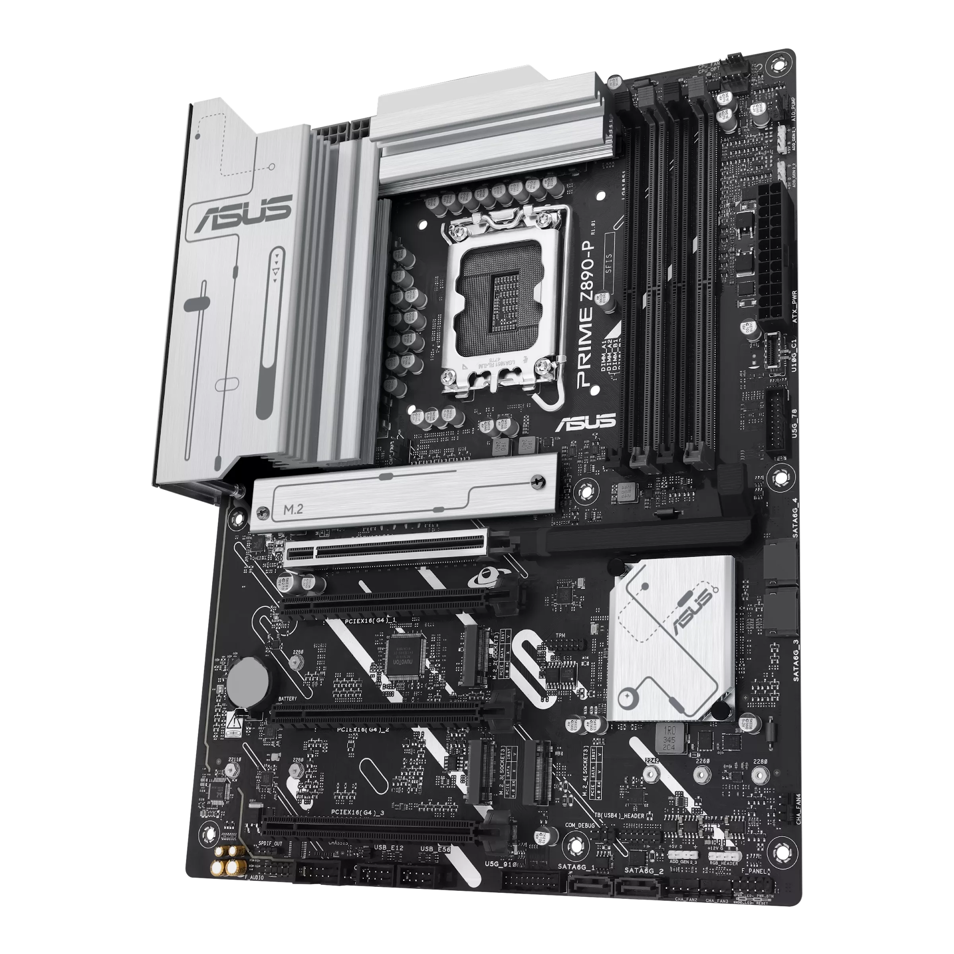 המוצר ASUS PRIME Z890-P הוא לוח אם בפורמט ATX עם שקע LGA1851, המיועד למעבדי אינטל מסדרת Core Ultra דור 15. הלוח תומך בזיכרון DDR5 מתקדם עם ארבעה חריצי DIMM המאפשרים עד 192GB של זיכרון RAM. הוא מצויד בצ'יפסט Intel Z890 העדכני ומציע תמיכה מלאה ב-PCIe 5.0 עבור כרטיסי מסך ואחסון.