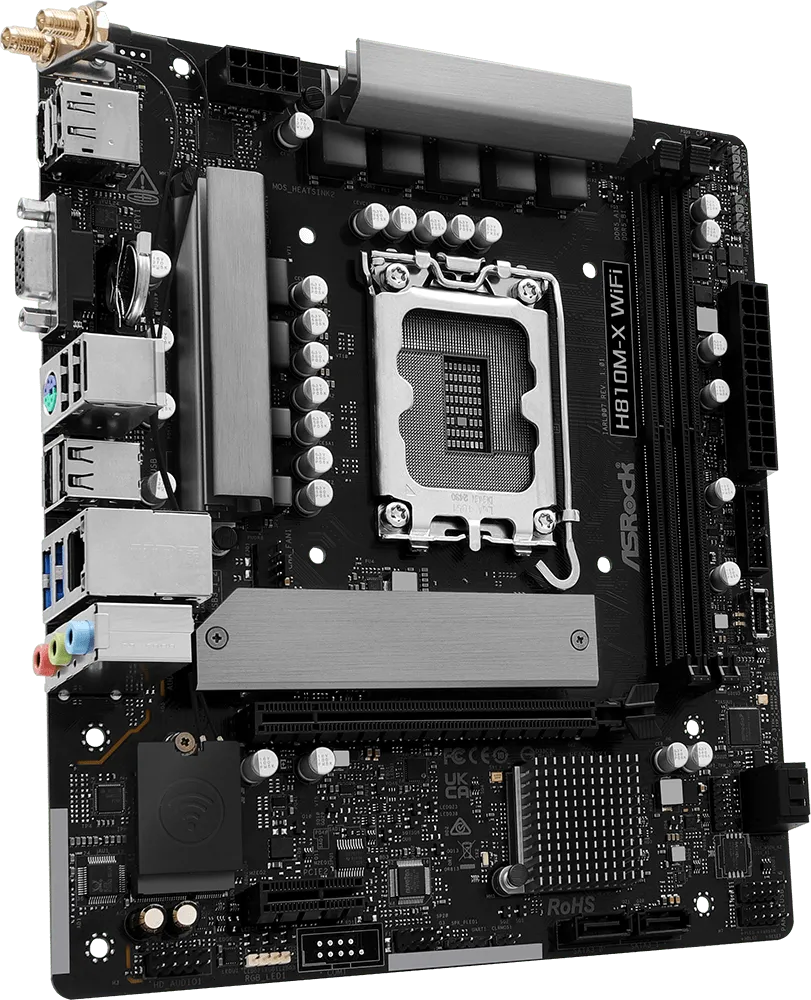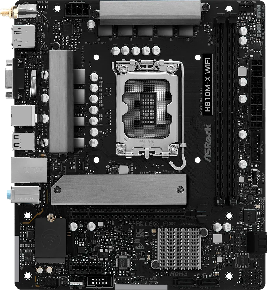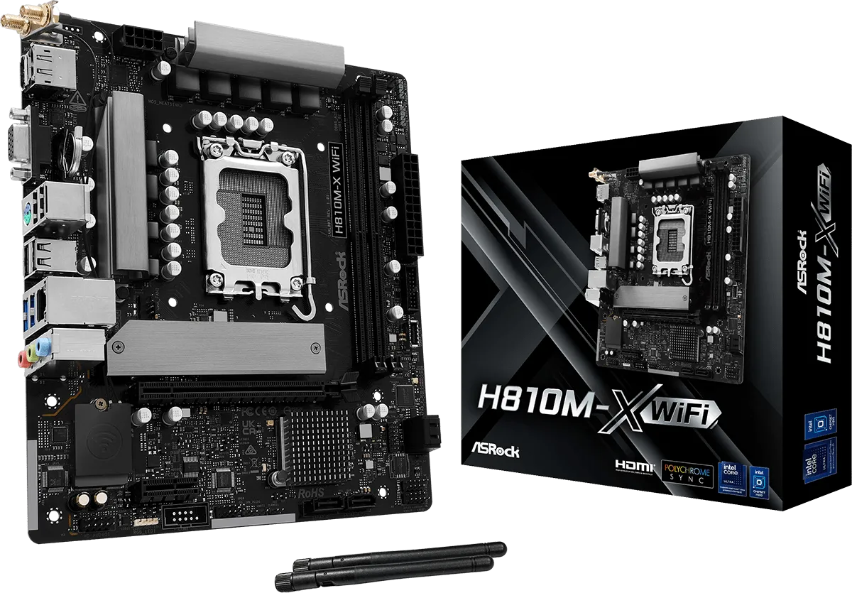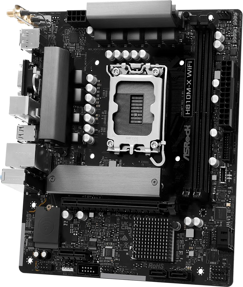 המוצר ASRock H810M-X WiFi הוא לוח אם בפורמט Micro ATX עם שקע LGA1851, המיועד למעבדי אינטל מסדרת Core Ultra (Series 2) דור 15. הלוח תומך בזיכרון DDR5 בערוץ כפול (Dual Channel) עם שני חריצי DIMM המאפשרים עד 128GB של זיכרון RAM במהירות של עד 6400MHz. הוא מצויד בצ'יפסט Intel H810 ומציע תמיכה בתקן PCIe 4.0 עבור כרטיסי מסך ואחסון מהיר.