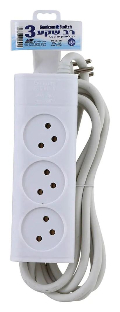 מפצל רב שקע לשקע חשמל ישראלי עם שלושה שקעים וכבל באורך כ- 3 מטר Semicom